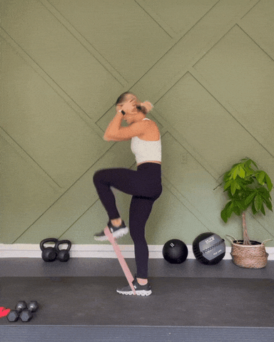 →呼气时对抗弹力带阻力,将工作腿膝盖向上提起,同时上半身轻微卷腹