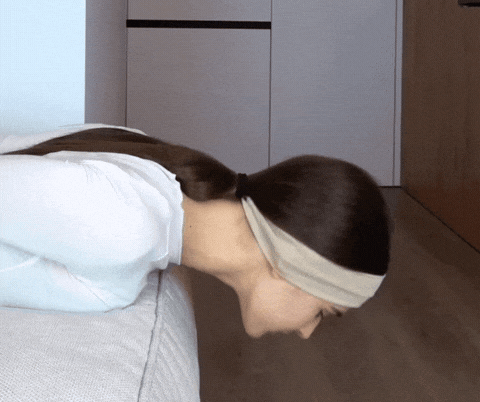 3. 呼气头慢慢上抬,用鼻子去触碰双手。